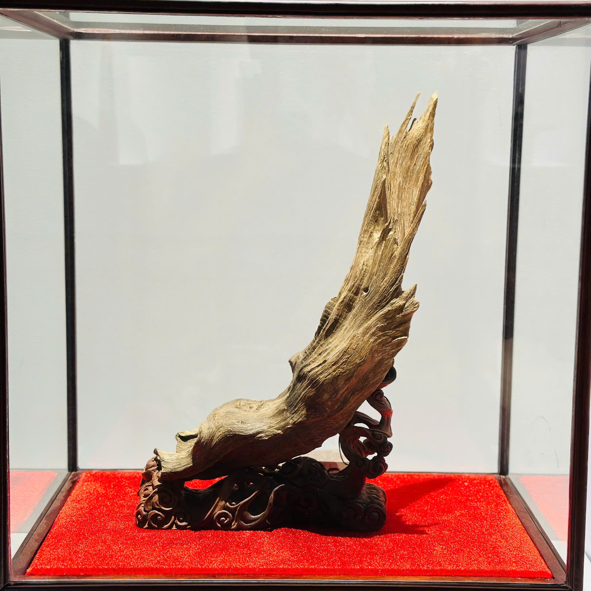 - Cách trưng bày: Trầm rục đã qua quá trình phân hủy lớp mộc nên rất thuần khiết. Tốt nhất nên trưng bày trong lồng kính trong suốt (như thiết kế nguyên bản) kèm đế gỗ trang trọng. Lồng kính vừa tôn lên vẻ đẹp bảo vật, vừa giúp lưu giữ trọn vẹn hương thơm và bảo vệ tác phẩm khỏi bụi bẩn, va đập.