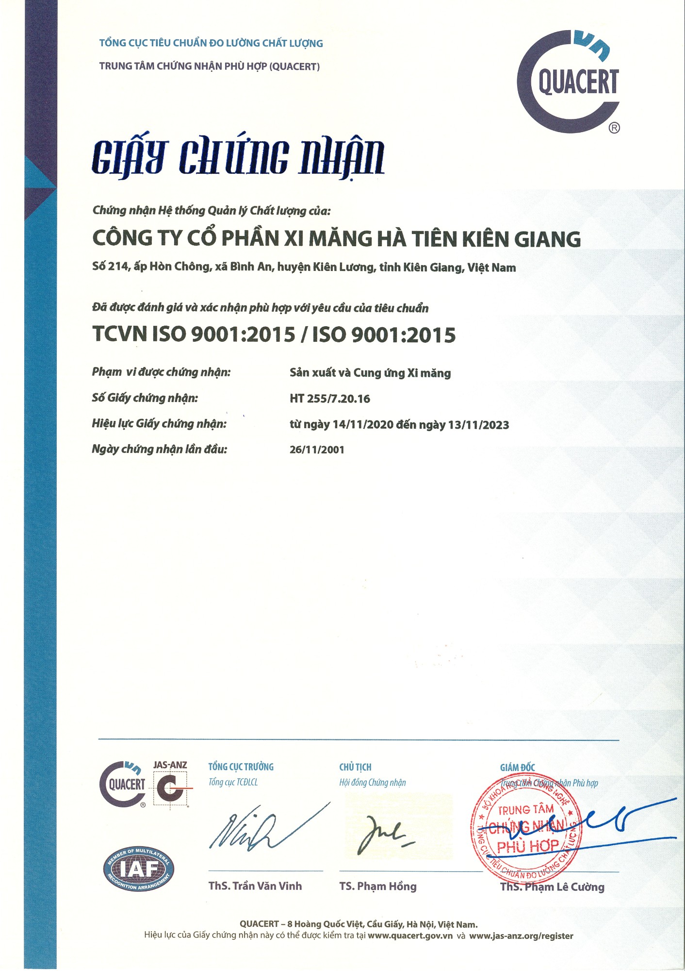 Công ty CP Xi măng Hà Tiên Kiên Giang áp dụng Hệ thống quản lý chất lượng Quốc tế ISO 9001:2015 đảm bảo kiểm soát chặt chẽ chất lượng sản phẩm từ khâu nhập nguyên liệu, tạo sản phẩm cho tới khâu xuất sản phẩm; Phòng thí nghiệm được công nhận phù hợp tiêu chuẩn Quốc tế ISO/IEC 17025:2017. Sản phẩm phù hợp tiêu chuẩn Việt Nam TCVN 6260:2009, quy chuẩn Việt Nam QCVN 16:2014/BXD.